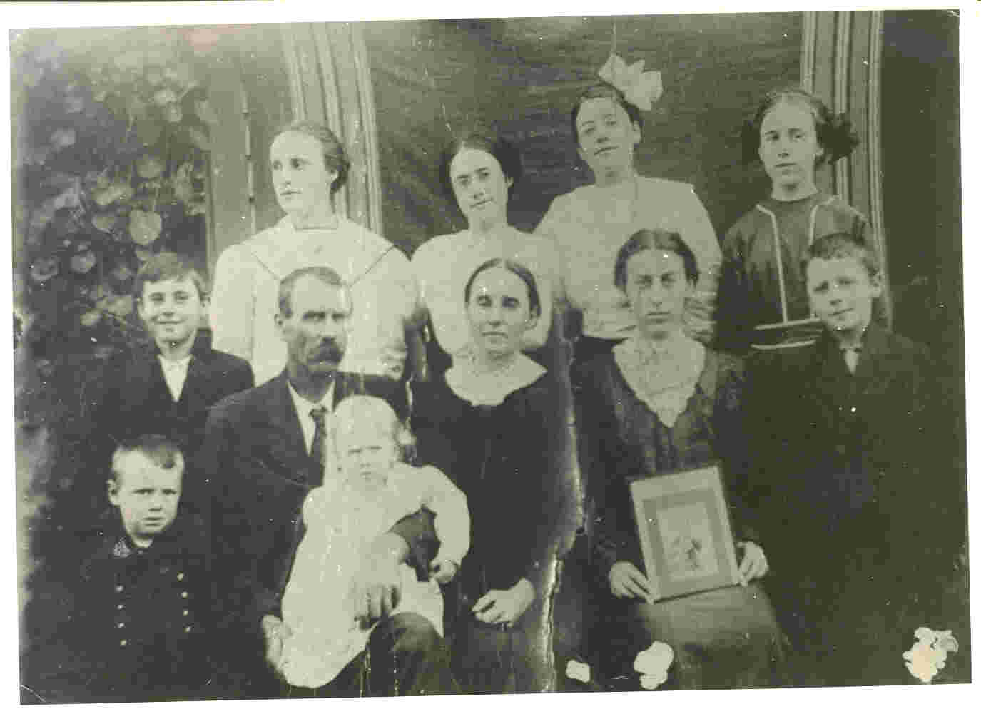 This is a 1911 photo of the GLENN family. Marshall Glenn, the oldest child, had already moved to Montana. Clydie is holding his picture. Joy was not born until 1912. At back left is Dixie,(my mother, born 1892), Hazel,(1894), Eunice(born 1896), Bernice(born 1898). Middle row; Greer (born 1901), Grandfather Louis Glenn,(born 1861), Grandmother Mary Caroline (CALLIE) Glenn (born 1871),Clydie (born(1890). Dr. Robert Glenn,(born 1904).Front; Ted, DDS.(born 1907), Grandfather Glenn is holding Ned,(born 1910). |