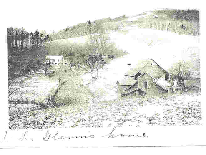 This is a long ago photo of the GLENN farm in Laurel Creek Township, Watauga County, N.C. The farm consisted of the usual farm buildings; chicken house and woodshed near the house. The large barn and a garage for the family car are in the foreground. Grandfather Glenn first had a Model "T" FORD car, reported to be one of the first autos in the community. PREVIOUS PAGE......NEXT PAGE |
