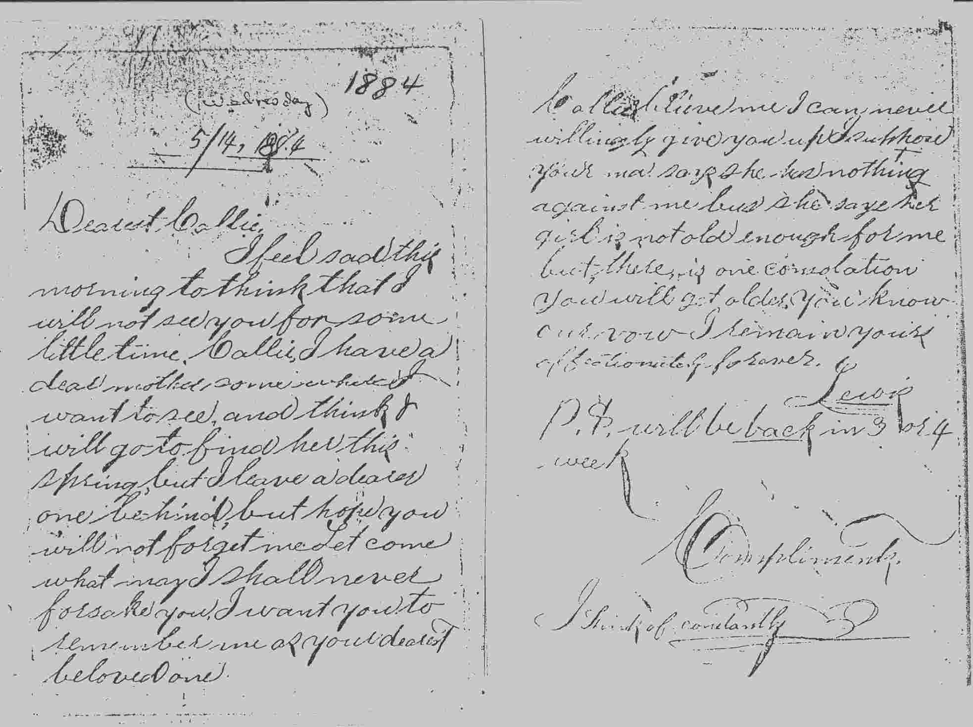 Louis Glenn writes another letter to Callie Greer in May, 1884. Louis writes " DEAREST CALLIE, I feel sad this morning to think that I will not see you for some little time. CALLIE, I have a dear mother somewhere I want to see, and think I will go to find her this spring, but I leave a dearer one behind, but I hope you will not forget me. Let come what may I shall never forsake you. I want you to remember me as your dearest beloved one. CALLIE, believe me, I can never willingly give you up. I suppose your mom says she has nothing against me but she says her girl is not old enough for me, but there is one consolation, you will get older. You know our vow. I remain yours affectionately forever. LOUIS P.S. Will be back in 3 or 4 weeks." Then he adds "I THINK OF YOU CONSTANTLY". Louis Glenn did go further over into southwestern North Carolina, and after searching some weeks, he finally found his mother. He had not seen or heard from her since 1867, when she abandoned him. Louis Glenn and Mary Caroline Greer were married June 6,1886. |