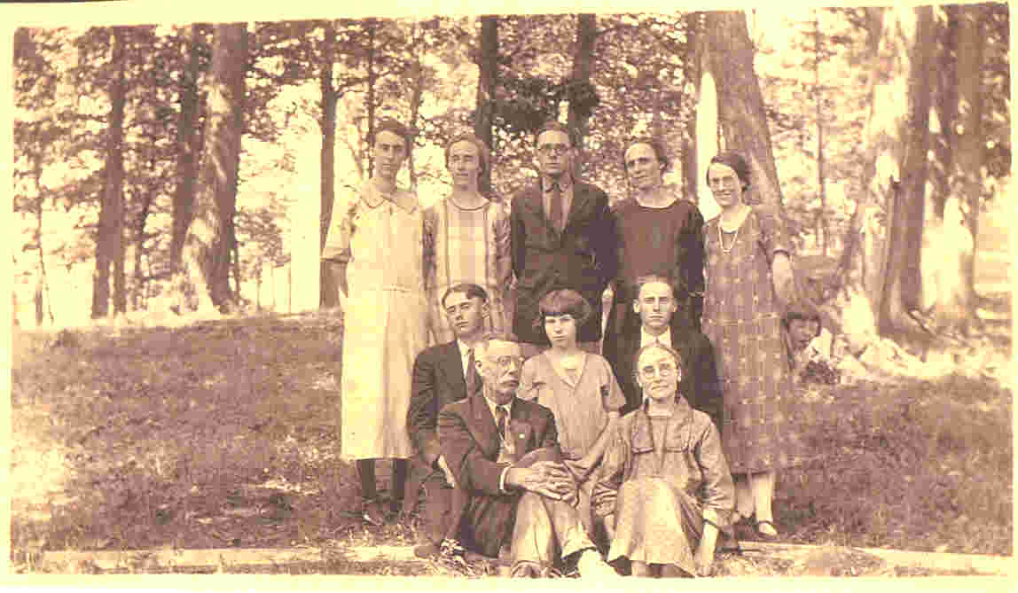 Another 1925 photo taken at the Louis and Callie Glenn Farm. Since Marshall Glenn, the oldest child, born 1888, with his new wife, Elizabeth, and daughter, Carolyn (born Dec.1909), had already moved to the Pacific Northwest, early 1910, they are not shown in many of these early GLENN FAMILY photos. At back left is CLYDIE (born 1890 ), BERNICE ( born 1898), ROBERT , Bob ( born 1904), DIXIE, my mother ( born 1892 ), HAZEL (born 1894 ). MIDDLE row: (TED born 1907), JOY ( born 1912), NED ( born 1910). Front is LOUIS and CALLIE GLENN.