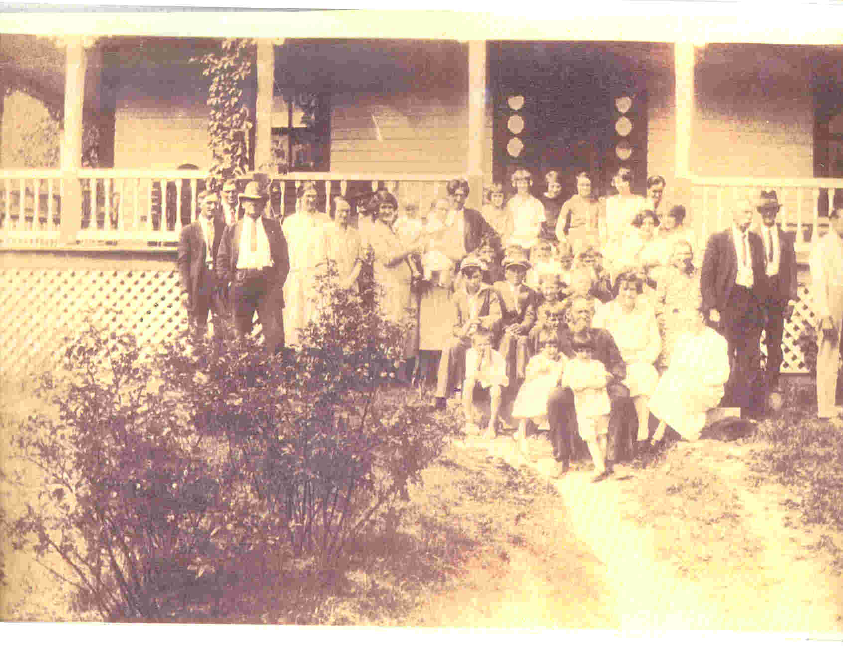 Another gathering of relatives at the GLENN farm about 1927. My dad is shown about tenth from left and mother is in front of him and is holding me,( born Dec.2,1926).Grandpa William Farthing (wearing hat)is 6th from left in back row.He is wearing hat.Grandpa Louis Glenn is standing,3rd from right(in black suit) and Grandma Callie Glenn is sitting in front of him. Sitting in front is Great Grandfather Richard E. Greer(Grandma Farthing's father). This was Richard Greer's birthday. Many other cousins and family members are also in the group. |