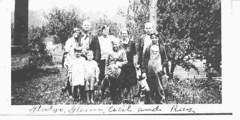 A photo from about 1926 was taken at the Aubyn Farthng house at Valle Crucis. Back from left; Leta Tester, my uncle Clyde Tester, Aunt Eunice Glenn Tester, Aunt Hazel Glenn Farthing, Uncle Ned Glenn, Front left; Gladys Tester, Glenn Farthing, Cecil Tester and Ray Farthing. Leta, Cecil and Gladys are children of Uncle Clyde and Aunt Eunice. Ray and Glenn are sons of uncle Aubyn and Aunt Hazel. The Testers had lived in Idaho and Montana since about 1915 and were in Watauga County, N.C. on a visit. Shortly after returning to Idaho, Cecil Tester died in 1927. He was brought back to Watauga County by train and was buried at the GREER cemetary at Grandpa Glenn's farm. |