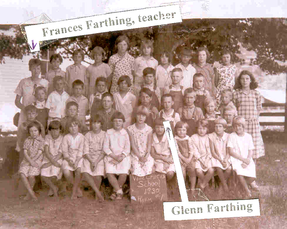 This 1930 photo, taken at the 3 room VALLE CRUCIS PUBLIC SCHOOL, shows my sister, Frances Farthing, TEACHER, at back left. ( She was only 18 years of age ). This was her first term as a school teacher. She had completed 2 years at Appalachian College in Boone, N.C. In this early era, North Carolina permitted teachers, who had completed some college terms, (but had not yet graduated) to teach in the public school system. Our double first cousin, Glenn Farthing, is taking 3rd grade this school year. This was a 3 room school, therefore each teacher had students in 2 or sometimes 3 different grades. Later, I went to the 3rd and 4th grades at this location. Several siblings also attended this school location. Photo provided by Glenn and Martha Farthing. |