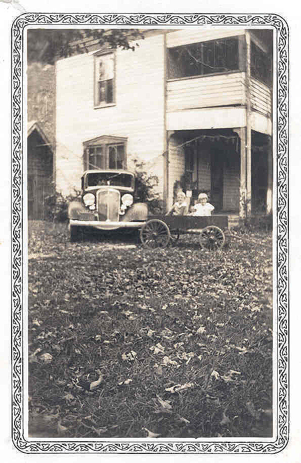 This mid-1930s photo shows the twins sitting in my new wagon ( built by Earl Tester). Our 1935 Chevrolet car is also shown in our yard. The cellar, ( built very early 30s), is at back left. I remember when my father constructed this cellar. | ||||