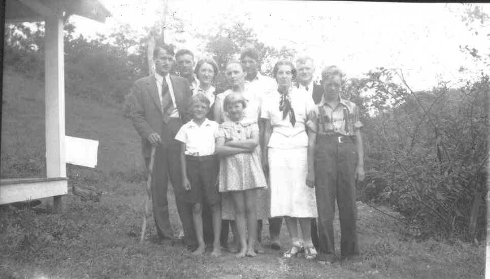 1938 photo shows all 8 of us with our Dad and Mother in our yard at the farm where we moved to early 1938 from Valle Crucis. At left is Wheeler,Louis, (just before he joined the U.S. navy). Frances, Mother and Dad, Laura, Raymond ( home on short leave from the U.S.Navy) and me. In front are the twins, Benjy and Dixie. | ||||