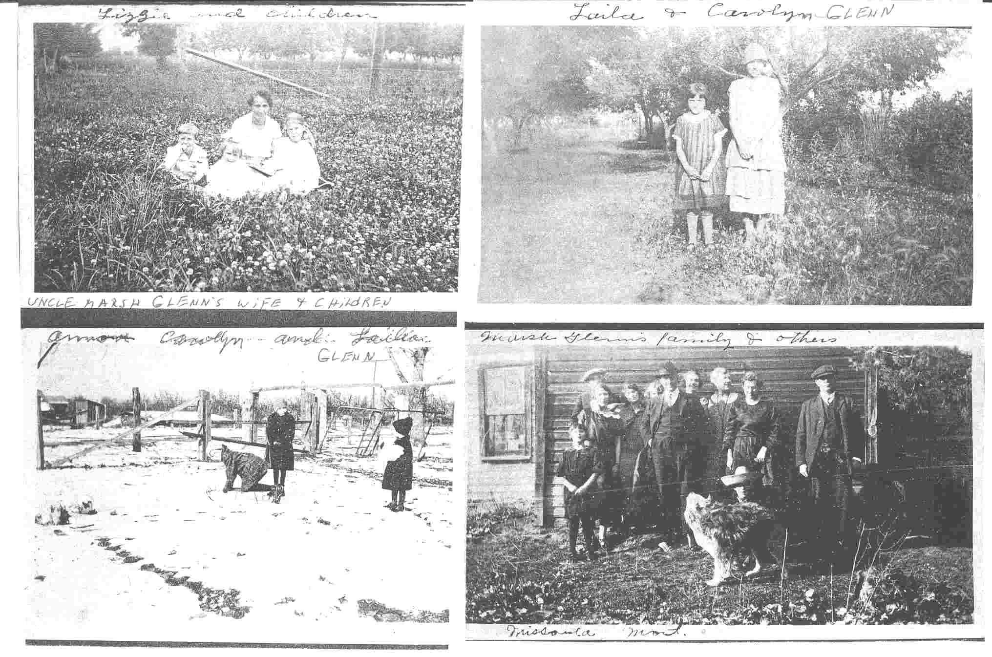 The Marsh Glenn family is shown in these 4 photos, mostly from the 1920s. They lived in Montana. Top left says; Lizzie and children, bottom left says Armon, Carolyn, and Laila. Top right says; Laila and Carolyn, bottom right; Marsh Glenn family and others, Missoula, Montana. |