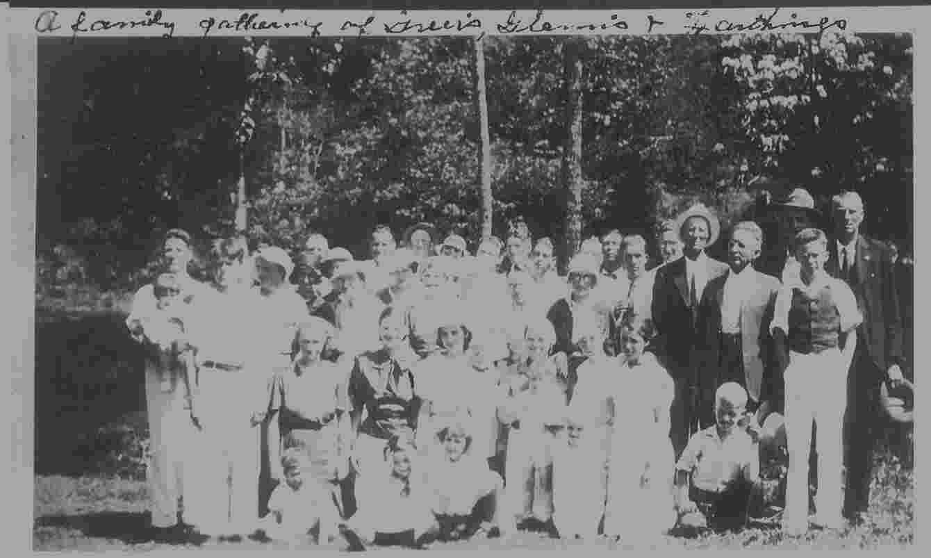 This large Glenn/Greer family gathering was held at the N.C. State fish hatchery, near Boone, N.C. in 1934. Grandpa Louis Glenn is at far right. Glenn farthing is in front of Louis Glenn and I,( Baxter Farthing) am knelling at left of Glenn. Mt dad, Ben Farthing, is near middle of back row and my mother is 4th from left. Many other family members are shown. |
