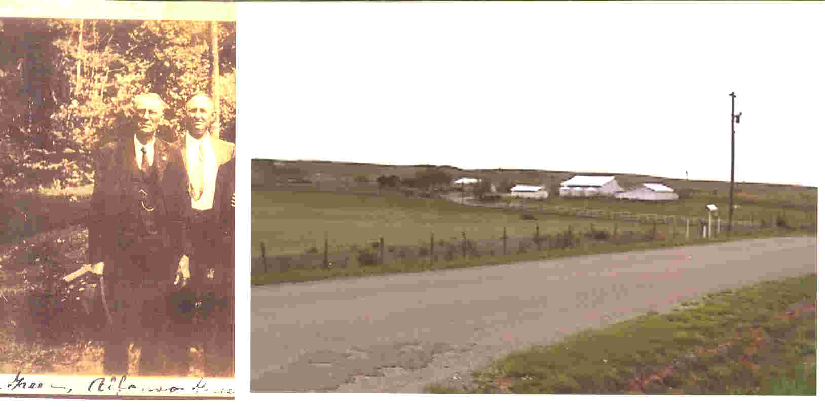 Louis Glenn is shown at left. Great Uncle Raymond Greer is also in the photo. A photo at right shows some of the buildings on the Raymond Greer 1920 acre farm in Custer County, Oklahoma. The brick house is located in the trees at left of the buildings. Great uncle Raymond was killed July 1945 in a tractor accident a few hundred yards to the right of the farm buildings. He was plowing ground when he got too close to the edge of a stream, (Wildhorse creek) and the bank broke off causing the tractor to overturn and pin him under the machine. I remember my Great Uncle Raymond Greer very well, as he would sometimes stop at our house in Watauga County for a short visit (My mother was his neice). In 1940, after the Republican National Convention was held in Philadelphia, Pa. he came by Watauga County on his way back to Custer County, Oklahoma. He was a delegate from Oklahoma to the Convention. This was the convention where Republicans nominated WENDELL WILKIE to oppose President Franklin Roosvelt, who was running for a THIRD term in the 1940 elections. April 2002, I stopped in Custer County, Oklahoma, and after inquiring at several farms in Western Custer County, I located 2 people who were neighbors to both Raymond and also Alfonso Greer and knew both of them well. I interviewed both individuals and they gave me a lot of valuable information relating to both Great Uncles,Raymond and Alfonso One lady who, with her husband, owned a large farm adjoining the Greer farm, related how she got a phone call from Hettie Greer who reported that Raymond had not came in for lunch. The lady then related that her husband got another neighbor and found the tractor overturned on top of Uncle Raymond. They managed to free Raymond from under the machine, but the sheriff determined that he was killed instantly.The other neighbor showed me where Raymonds 1920 acre farm was located and also where the tractor turned over on Raymond causing his death. |