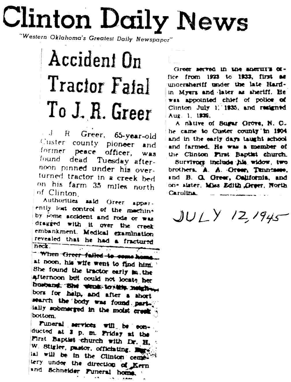 GREAT UNCLE Raymond GREER obituary in Oklahoma newspaper, July 12, 1945.
