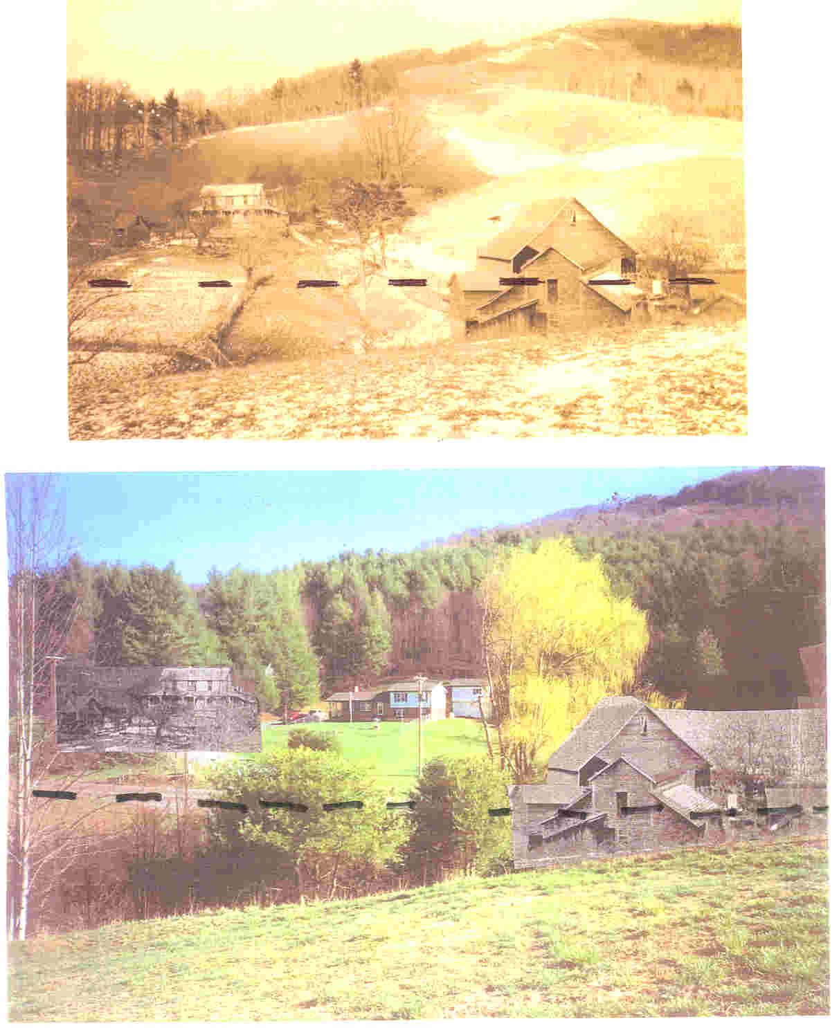Long ago Glenn farm is shown in upper picture. Most grandchildren would have many pleasant memories of this GLENN homeplace Lower photo shows the area today. U.S. highway 321 (dotted line)was put through this area in the mid 1950s. This picture shows where the original house and barn stood many decades ago. Note the NEW house located to the right of the "old original house" which was taken down mid-1950s. |
