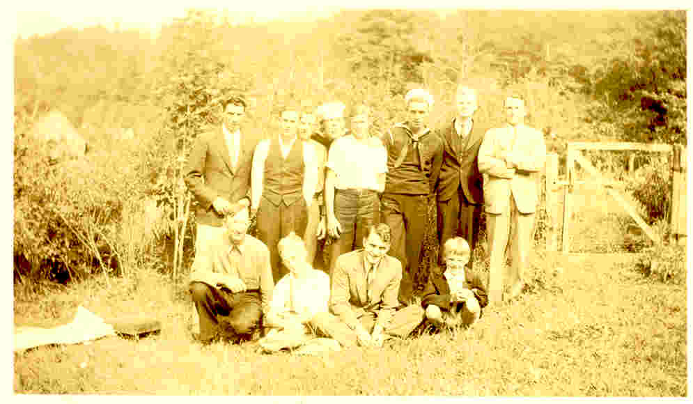 1938 photo was taken at the Ralph and Laura Farthing Church place at Valle Crucis. Louis and Raymond Farthing were both on leave from the Navy. Back row from left is: Harry Rowe, Frank Caudill, Douglas Glovier, Louis Farthing, Earnest Caudill, Howard Rowe,( also on Navy leave. He and Louis joined the Navy at the same time), Raymond Farthing and Laura's husband, Ralph Church. Front row:Charles Church, (Ralph's father), me( Baxter Farthing), Brother, Wheeler Farthing and Brother, Benjy Farthing. PREVIOUS PAGE..NEXT PAGE |