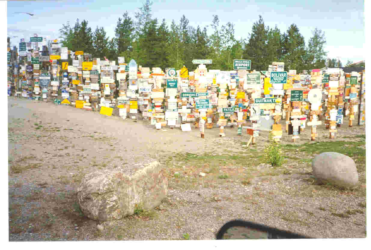 The famous SIGNPOST FOREST is located in the Yukon at mile 600 on the ALASKA HWY. At this date, there are over 40,000 signs posted here, mostly giving the hometowns of travelers on the ALASKA HWY.
