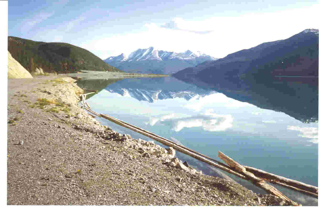 Muncho Lake (mile 450 on the AK.HWY) is shown with the beautiful reflection of mountains and clouds. Alaska Highway is at left.