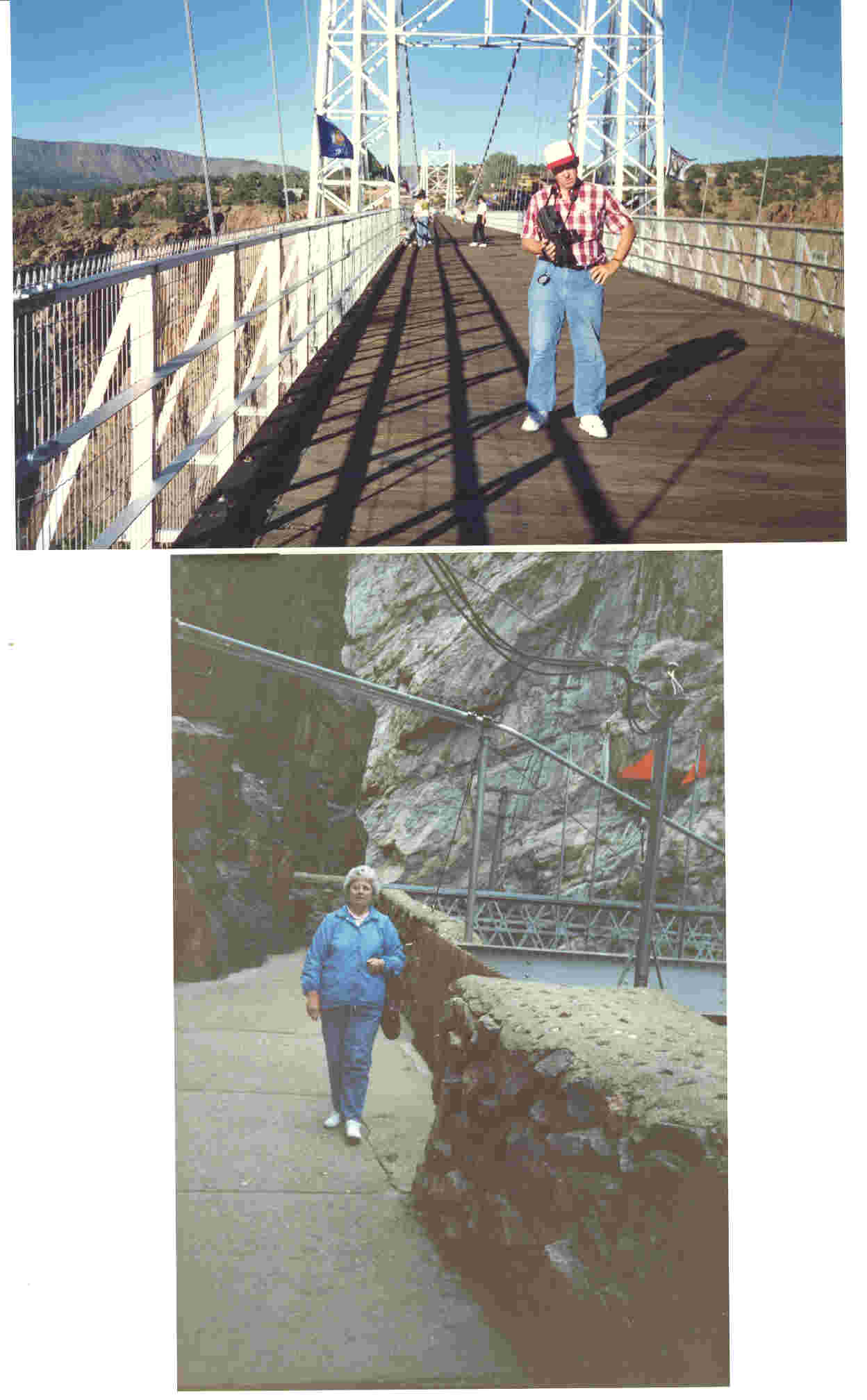 We visited the Royal Gorge in southern Colorado on our 1990 trip. I am standing on the bridge than spans the Royal Gorge nearly 1000 feet below. The Arkansas river and a major railroad runs through gorge. In 1946, I was put on a train with several dozen other Naval personel in Oakland, California for a train trip across the U.S. to the U.S. Naval Station at Little Creek, Virginia for discharge. The train went through the Royal Gorge and I remember looking up and observing the bridge high above the train. Lower photo shows Reba alongside the tracks at the bottom of the gorge. An incline rail car takes sightseers to the bottom of the gorge. |