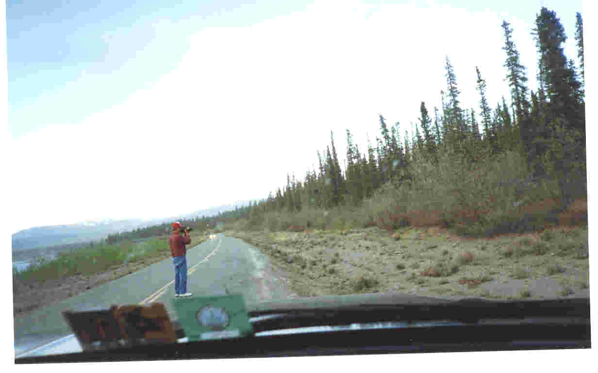 Reba snaps a picture of me as I am getting vidoes of a large bear near the Alaska highway, May 1999.