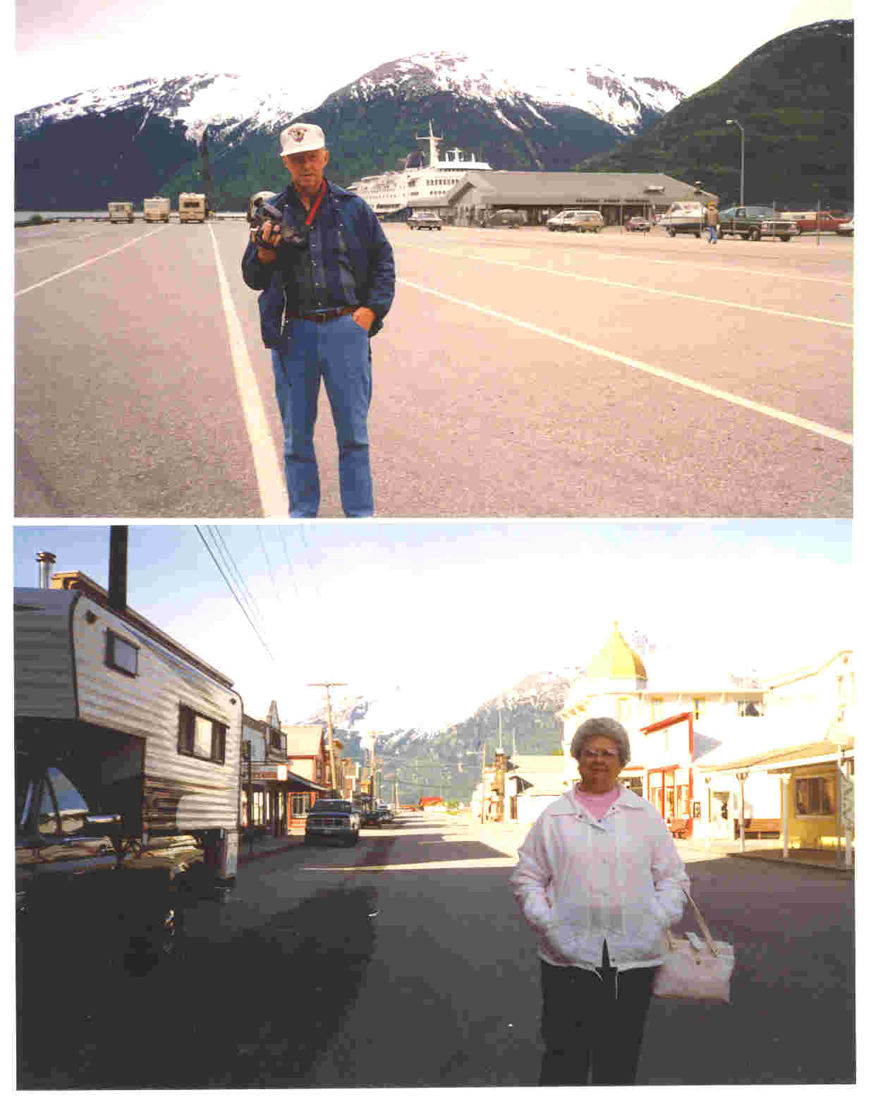 Reba and I arrive in Skagway, Alaska, May 17, 1993 aboard the Columbia. We boarded last Friday May 14 with our RV at Bellingham, Washington. We cruised up the INSIDE passage 1000 miles to Skagway, the end of the line for this trip. Note: Some "ALASKA HIGHWAY" photos would be from our 1993 Alaska trip and some pics are from the 1999 trip. |