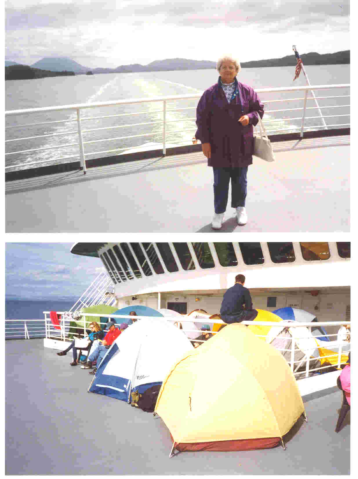 We are aboard the COLUMBIA for cruise to Alaska. Upper pic shows Reba with "inside passage" scenery in background. Lower pic shows passengers "camped out" in tents. Some of them slept on deck in sleeping bags. Reba and I had a stateroom..Our RV was parked with 155 other vehicles on lower parking deck. |