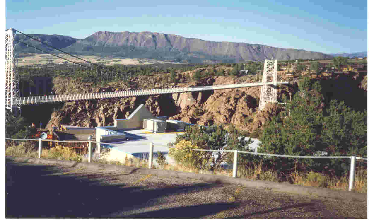 Royal Gorge Bridge in Colorado is shown. The Arkansas river flows thru this deep gorge, 1000 feet under this bridge. Also, railroad tracks run along by the river bed. We visited this area in 1990.