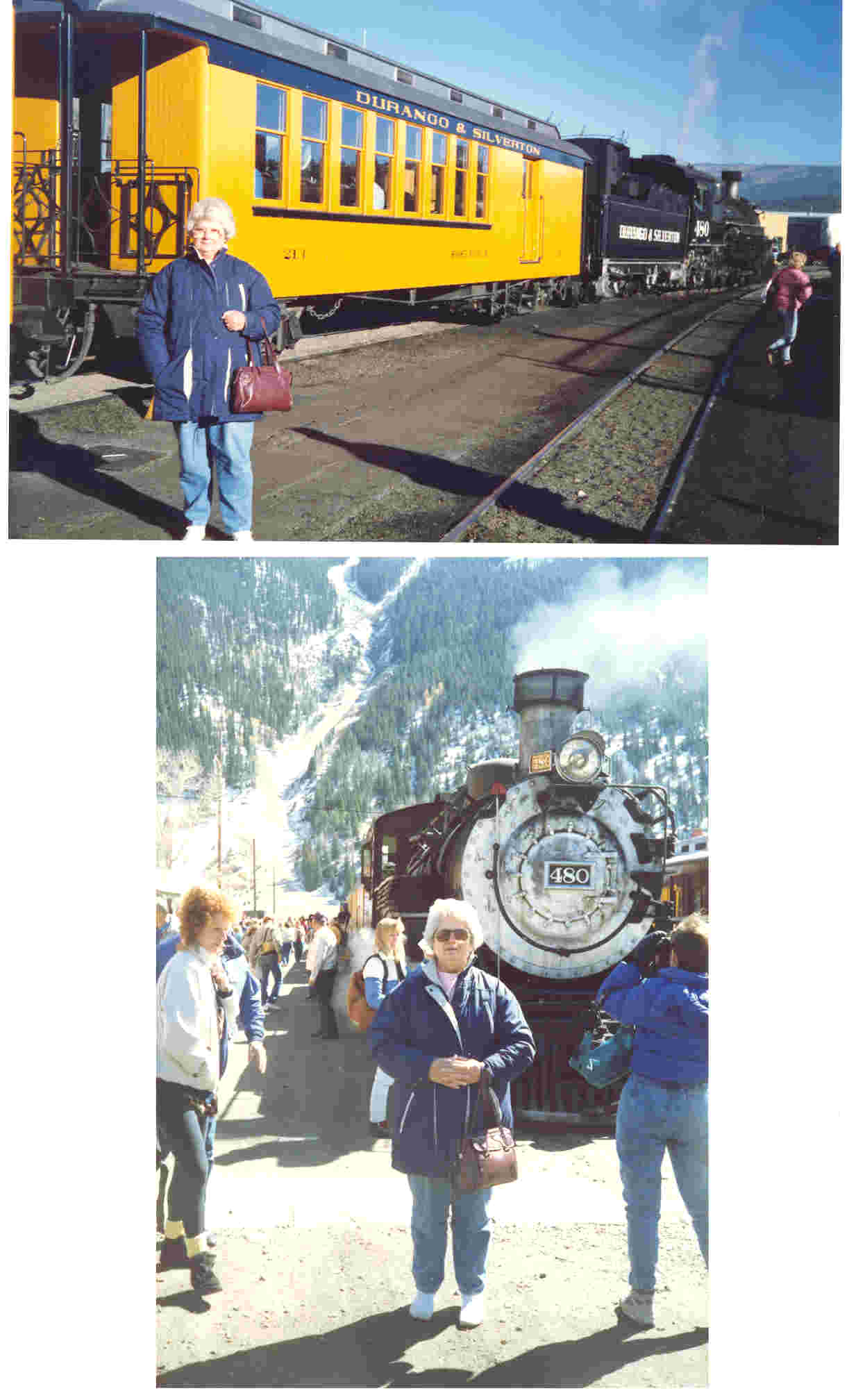 Upper pic is Reba Farthing in front of a Durango RR car. Lower pic shows Reba in front of the Steam Locomotive that pulled the cars loaded with passengers ( including us) on the all day round trip from Durango to Silverton, Colorado and back, fall of 1990. |