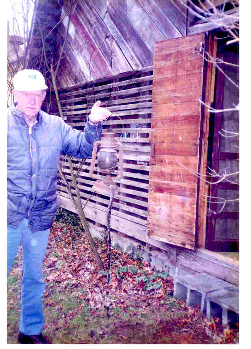 Mid 1990s photo shows me holding an old lantern from long ago. This lantern was hanging in our cellar for decades when a black snake was exploring, probably for food, and stuck its head into the rusty fuel reservoir and got its head caught in such a manner that it could not get the head out. When I found it, the snake had been dead a few days. PREVIOUS PAGE...NEXT PAGE |