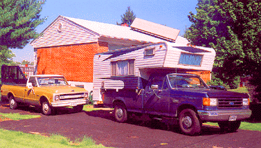 BELOW: This photo taken in 2003 shows the same RV attached to our 1987 Ford truck. The original truck is shown in back. We have traveled extensively in these two vehicles, including two trips to Alaska. | ||||||||||