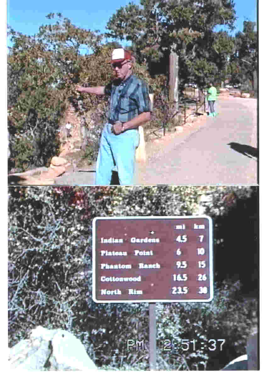 Upper picture, I am shown discussing the Bright Angel Trail at the South rim of the Grand Canyon. I am preparing to walk six miles down the Bright Angel Trail to Plateau Point, overlooking the Colorado river. Lower sign gives distances to various points at the South Rim of the canyon. |
