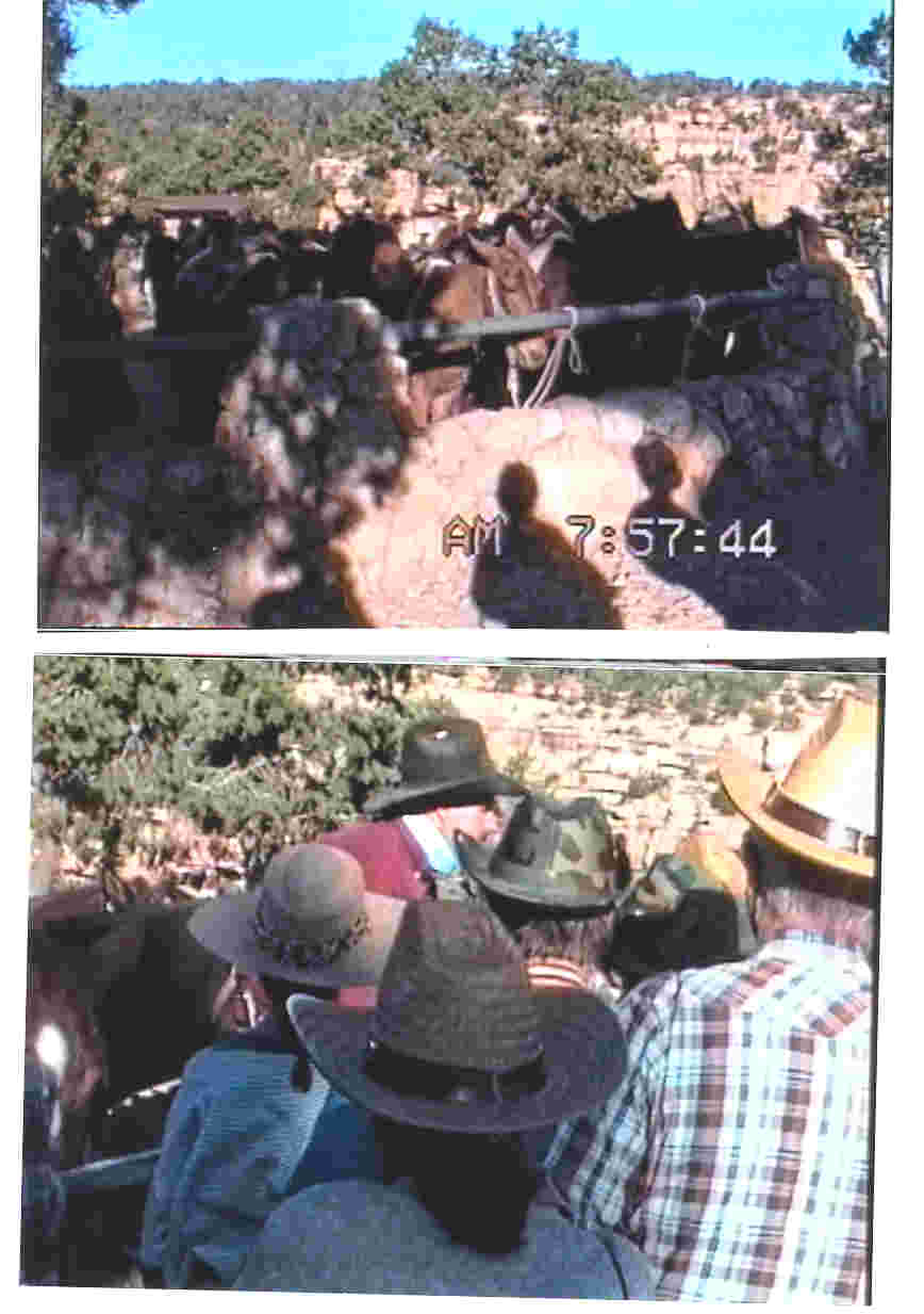 Upper pic, from 1990, includes some of the Grand Canyon Mules that carry riders down into the Canyon. NOTE the time is early in the morning, as riders are gathering here for the famous mule trip down into the Canyon. Lower pic shows the Wrangler giving instructions to riders who are preparing to ride mules down into the Grand Canyon. I believe the Wranglers name is Ron Clayton, who is reported to be the head man in charge of the "MULE TRANSPORT SYSTEM" in the GRAND CANYON. He reported on TV some years ago, that most of the "Grand Canyon" mules are provided by a livestock dealer in central Tennessee. The mules go through a "training" period before starting service on the GRAND CANYON TRAIL system. |