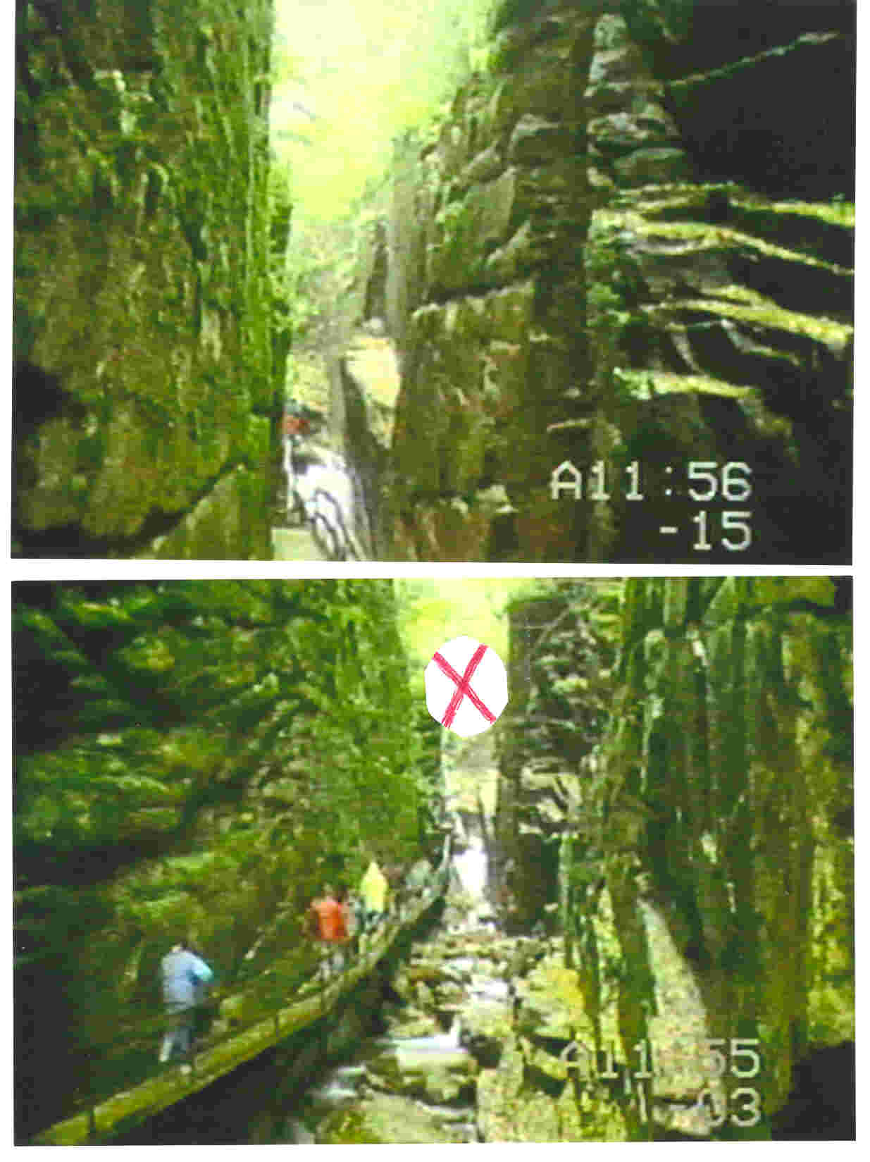 This area in the New Hampshire mountains is called THE FLUME. A bold stream flows through this huge rock formation cutting a deep channel through the formation. The lower photo with the X indicates that a very large boulder had been lodged for eons of time, somewhere between the high walls of this deep channel in the formation. The boulder was dislodged in a flood years ago. |