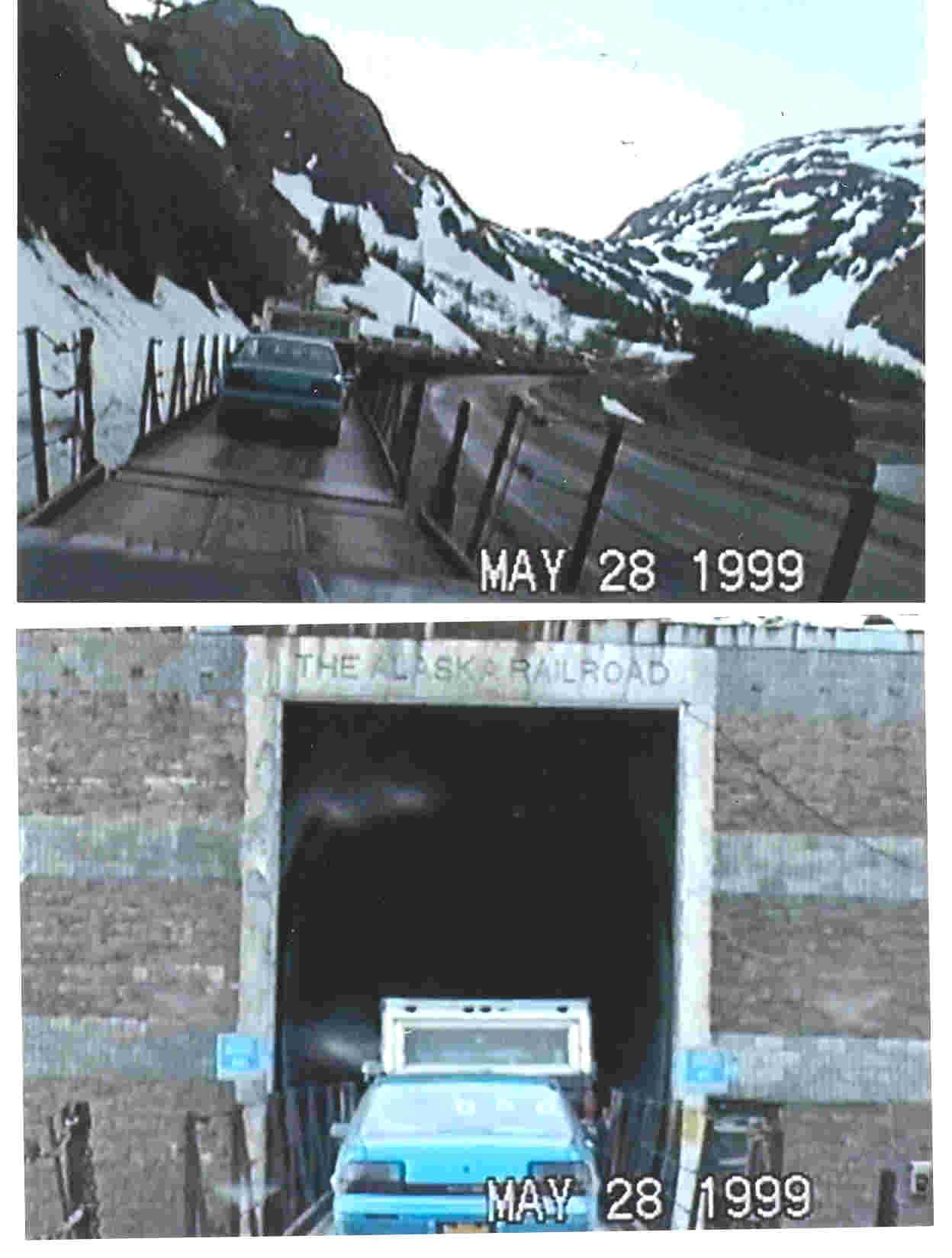 We ride the Railroad 12 miles to Whittier, Alaska. When we visited Alaska, this RR was about the only way we could take our vehicle to Whittier on the Prince William Sound. The RR runs from Portage, 50 miles south of Anchorage, and goes thru 2 tunnels before reaching Whittier. We drove upon the flatcar at Portage along with several other motor vehicles. About 45 minutes later we arrived in Whittier. The cost was $90.00 for the round trip. Some time after we were there, Alaska constructed a hardtop road the 12 mile distance. The 2 tunnels were paved, in order to accomodate motor vehicles, except the RR tracks were kept to accomodate the rail travel. |