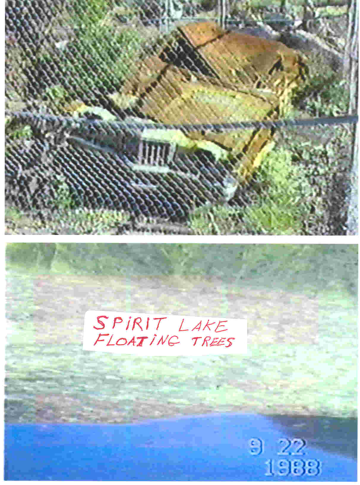 Upper pic shows the remnants of a car that was blown here from several hundred feet away by the force of the eruption. The forest service left it here for the public to view. Records show that 57 people lost their lives in the explosion. Spirit Lake is shown in lower pic and has thousands of trees still floating after being blown here by the force of the eruption. Millions of tons of earth filled the lake after the mountain erupted, which, according to the forest service raised the lake level 100 feet. Harry Truman, who operated a fish camp on the lake, was covered underneath the tons of earth when the mountain exploded May 18,1980. |