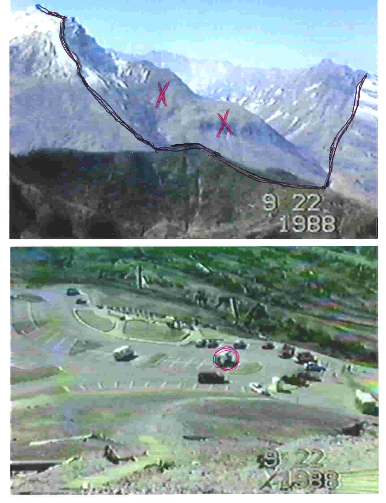 The crater is shown from a viewing area several hundred feet above the parking area at the end of the road. The side of the crater is marked and the X shows how the earth has been pushed upward over 100 feet since the 1980 eruption. My vehicle (red circle)is shown in the parking lot. PREVIOUS PAGE....NEXT PAGE |