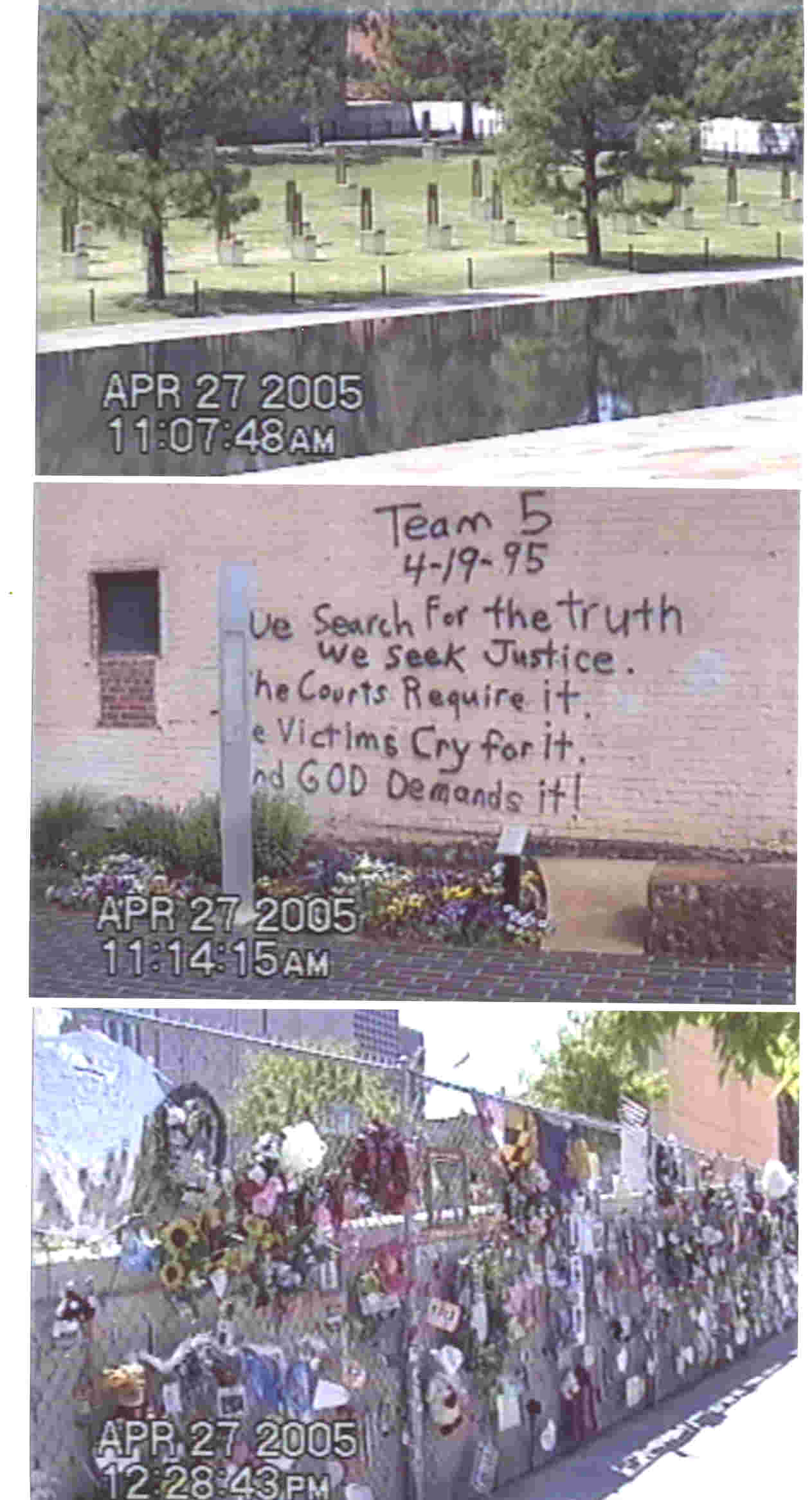 OKLAHOMA CITY bombing location.Upper pic shows original location of the MURRAH FEDERAL office building that was destroyed in 1995 by Tim McVeigh. Middle pic shows the message that was printed on adjoining building that was heavily damaged by the blast. This building also houses a very interesting museum about the blast. Some upper floors of this structure were so badly damaged they are no longer used. Many other buildings were damaged by the explosion. Lower pic shows momentoes left by friends of the 168 people killed by the blast. |
