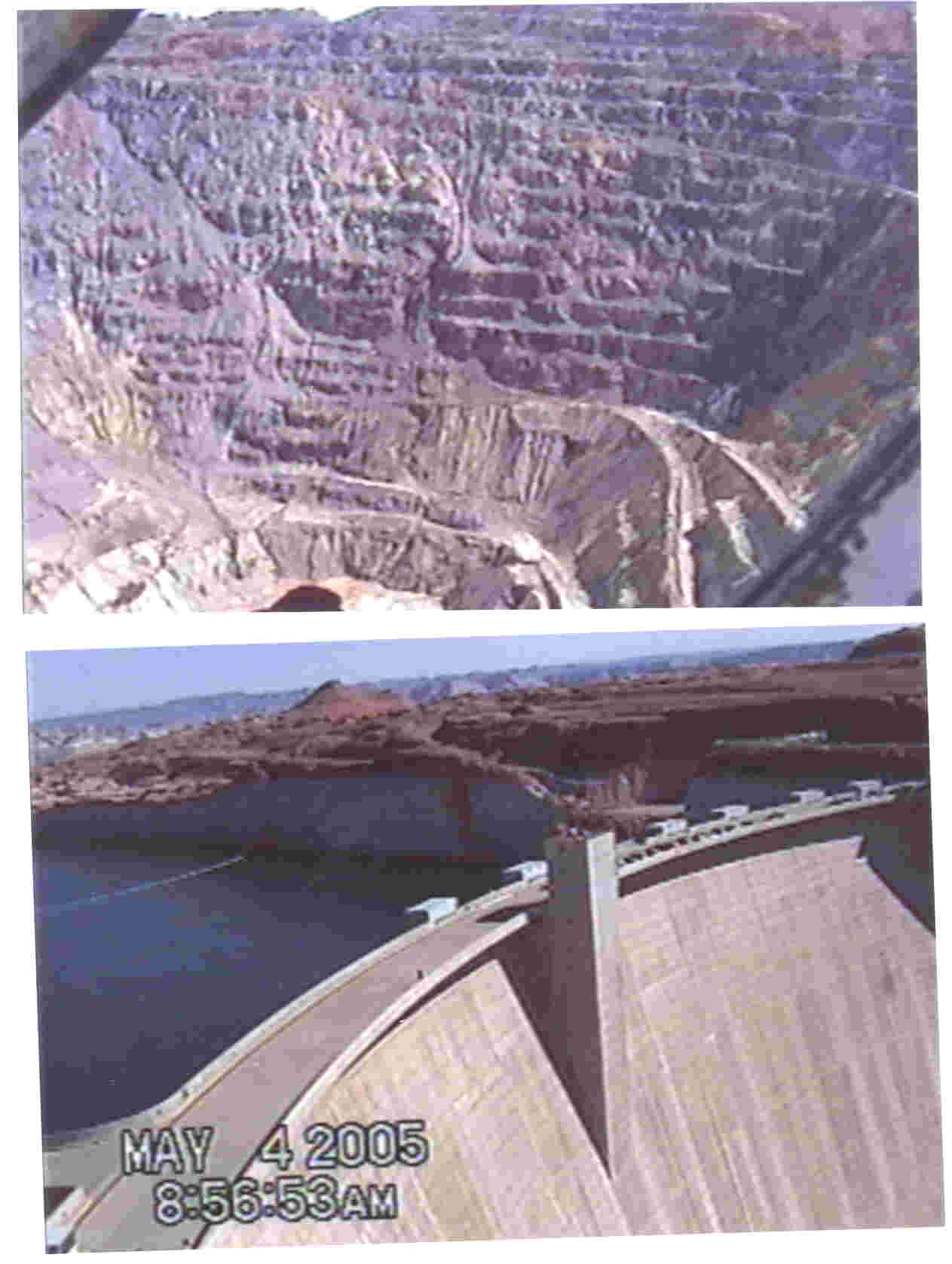 This is a COPPER PIT ( Copper ore mine) at Bisbee, Arizona, in the southern boundry of the state, near the Mexican border. This area was formerly a heavy copper producer. We passed through this area May 2005. Lower pic shows the Glen Canyon Dam at Page, Arizona. |