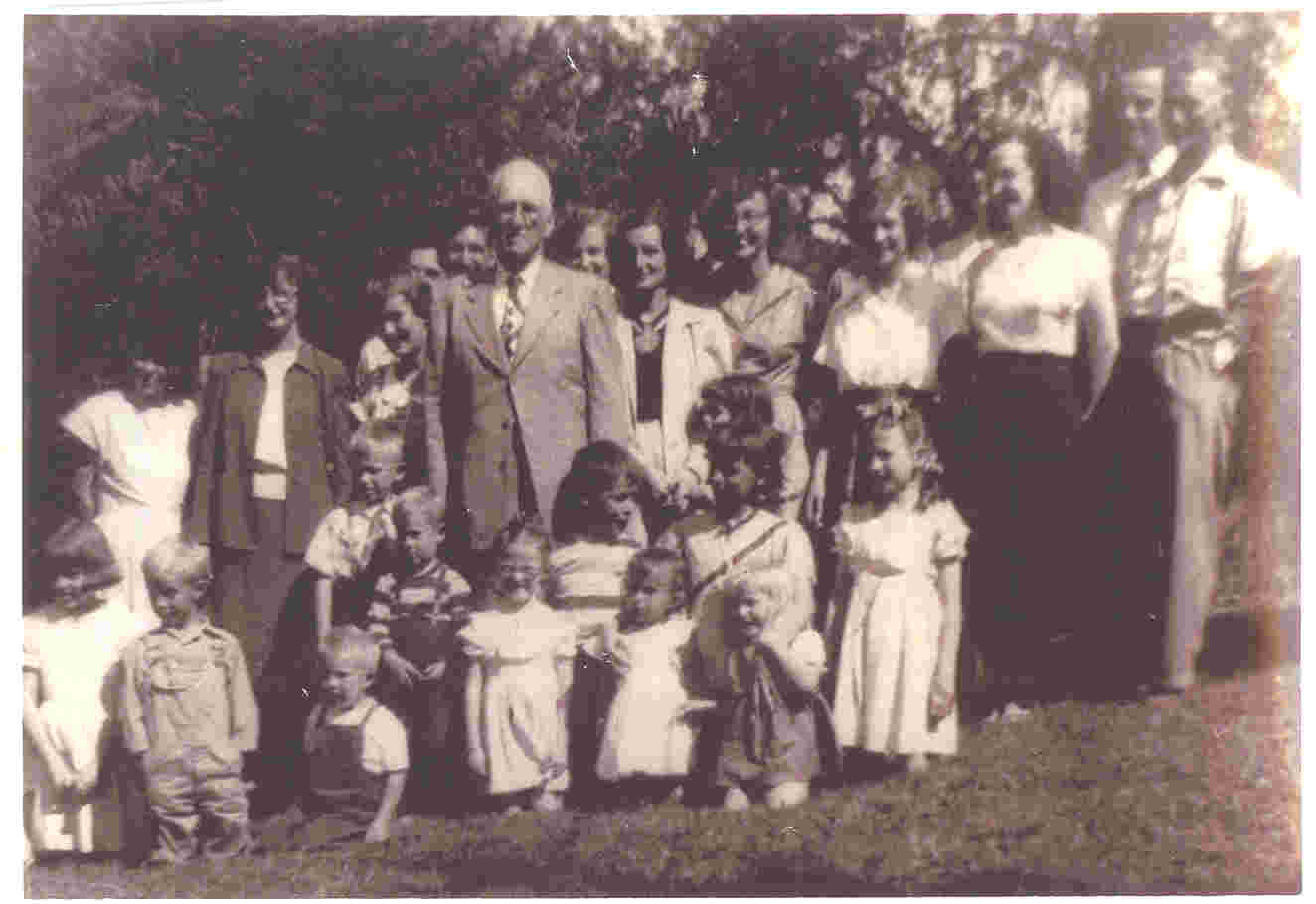 Photo appears to taken at the same family gathering as previous picture,(from about 1950) features Grandfather William J.Farthing and many of his grandchildren. Behind his shoulder at right appears to be my sister Dixie Rae Farthing. At right of him is first cousin Mable Farthing SPACH and at right of Mable is her sister Jimmie Farthing MAST. At extreme right is first cousin Barton Farthing and next to Barton in front row is my double first cousin Mary Hazel Farthing MAST. Standing at left is my sister Laura Farthing CHURCH and next to her is my first cousin Peggy Ann Farthing. The young children in front would now ( 2006) be in their 60s. |