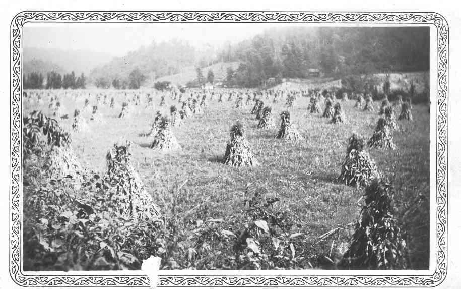 This shows one of our fields along Cove Creek. This "bottom land " was planted in corn every year. This shows the corn after it had been cut and placed in "shocks" as was nearly always done in the fall as the corn matured and became ripe enough to harvest. We would pull the corn, including the corn shuck, and haul the corn and store it in the second level of the big barn. It was used as feed for the cattle and sheep during the winter months. The corn fodder was hauled to an area near the barn and stacked to also be used to feed cattle during the winter. Several acres of corn were planted on the "home place" and also the "Greer" farm, one mile up the Watauga river. As already related on this website, we always planted the seed corn that my grandfather, William J. Farthing, developed himself at his farm several years prior to this period. The "William Farthing" hybrid seed corn produced a larger yield per acre, and had a stronger root system than other seed corn. |