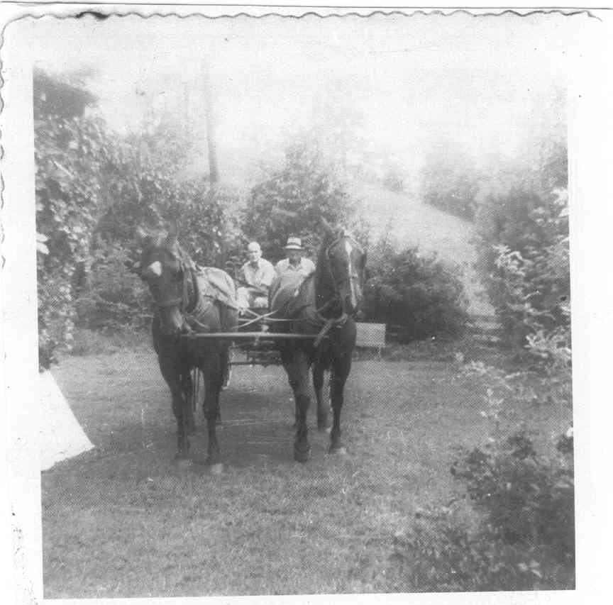 This photo probably made 1949 in our yard at the Farthing farm, shows my father, Ben W. Farthing, at right, with his buggy and our work horses, Maude and Bird. Dad had bid off the buggy at a farm auction in 1948 at the "Will Winkler" farm located nearby. Mr. Winkler had died prior to the auction and his large farm property and horse drawn farm implements were auctioned off as part of the estate settlement. Dad purchased some of the other implements in addition to the buggy. Ben Ward bid off the 200+ acre farm for $33,000.00. |