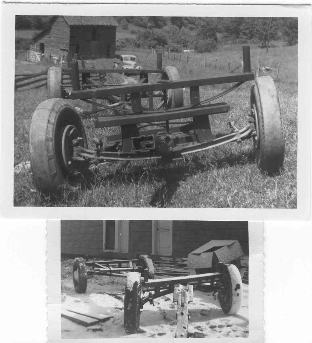 Top photo shows the first farm wagon that I built in the early 1950s. I had an electric welder and had learned welding in Cleveland, Ohio, some years earlier. I had a small workshop in the basement of the house at the GREER place, where I made this wagon. My dad had built the GREER house in 1946 after he took down the old original house that stood here many years. In the background is the old barn built many years ago by my Great Grandfather, Richard Greer. Also, shown in back, is the 1941 Chevrolet pickup truck that Dad purchased new in Boone, N.C. The retail price of this vehicle was $713.00 The bottom photo shows a " better" and lighter weight wagon I designed and built. As shown in the photo, some snow had fallen. The axles were two "front" axles from Ford cars from late 20s-30s models. I turned the axels over " upside down" in order to give plenty of ground clearance. Each wagon had the original mechanical brakes on the rear axle. I connected the brakes to an iron control rod, from which the operator could easly apply the brakes. These wagons weighed 550 lbs ( without the wagon bed)and would haul very heavy loads. I built and sold about 5 of these wagons and sold them for $90.00 each. |