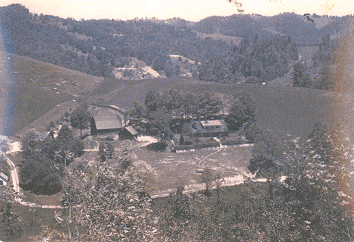 BELOW: Dad and Mom acquired full title to this farm in 1938. This photograph was furnished by Ray Ward, and was taken about 1949. On Nov. 1, 1993 the Watauga Democrat printed a story written by Jerry R. Phillips. Excerpts follow: It took about a year and a half and more than $1,800 for consulting fees and other expenses, but Dr. Frances Farthing along with her brother Baxter Farthing,and sister, Dixie Farthing HUFF of Chilhowie, Va. got the farm where they grew up listed this year on the National Register of Historic Places......Nestled above the north bank of the Watauga River in the Sugar Grove community just below the mouth of Cove Creek, the yellow, 2-story frame house sits nearly obscured by maples, pines, walnuts and apple trees......Among the elements nominated for registry are the landscape features, including the stonework ( walkways and stone walls,etc ) designed and installed by Ben W.Farthing. Most of the stonework was laid in the 1938-1941 period. ....."The Farthing Farm," the text continues, "with its house, out-buildings, vernacular rock landscape and pristine mountain terrain still conveys a strong image of a middle-class Watauga County farmstead from the years of the farm's primary significance. NOTE: THE NEXT PHOTO (5A) WAS TAKEN, 1938, FROM THE HILL AT FAR LEFT OF THE BUILDINGS AND SHOWS END VIEW OF THE HOUSE AND LARGE BARN." |