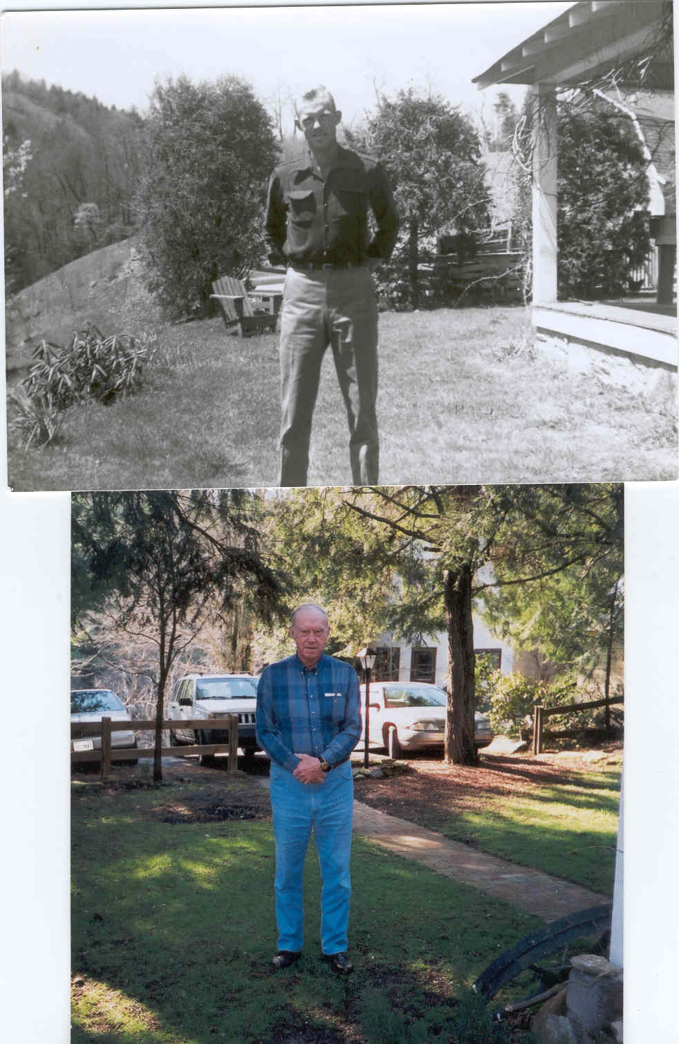 I am shown in the top photo, about 1950, at the Farthing farm. Lower photo; I am shown 54 years later,( 2004 ) standing in the same yard. Baxter Farthing