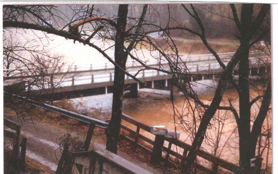 Early 1990s photo shows the flood condition at the bridge at the Farthing Farm property. The Watauga river and other streams in Watauga County, N.C. flooded during the 1990s. The bridge is a modern double lane structure that opened in 1985. Two different bridges spanned the Watauga River prior to 1985. The first bridge was a "self supporting" steel bridge that was constructed in the 1920s. ( Shown in an earlier photo ).This single lane bridge washed out in the 1940 flood. The next bridge was also single lane, but was supported by two cement supports in the river. ( which the earlier bridge did not have). Due to increased traffic, the bridge shown is double lane. |