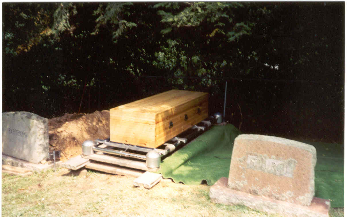 My sister, Frances Farthing, died August, 2000. This is a photo of the "homemade" casket she was buried in at a cemetary at Valle Crucis, N.C. She had a carpenter construct this casket for her. It cost $500.00. Dad and Mother are buried on the left. |
