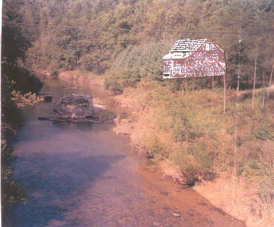 Looking closly in the distance, the outline of the log house can barely be seen. Photo at right was taken from the Watauga river Bridge, 2004, and shows the huge rock in the river. I placed an image of the old house in approximately its original location. NOTE: All previous photos on this web site were installed by my nephew, BEN FARTHING, of Lenoir, N.C. |
