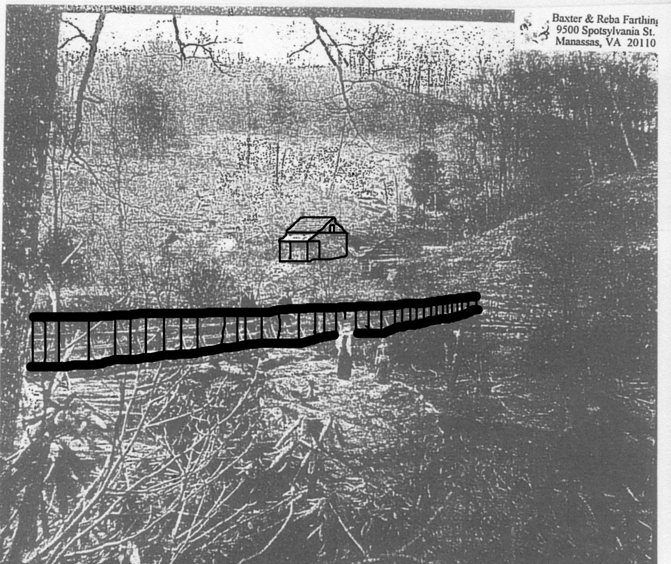 The photo at left is very dull and hard to see. The original photo was made many decades ago, and shows a footlog with handrails. This structure spans the Watauga river, and crosses the huge rock in the middle of the river. Note the people standing on the huge rock. | |||||||
