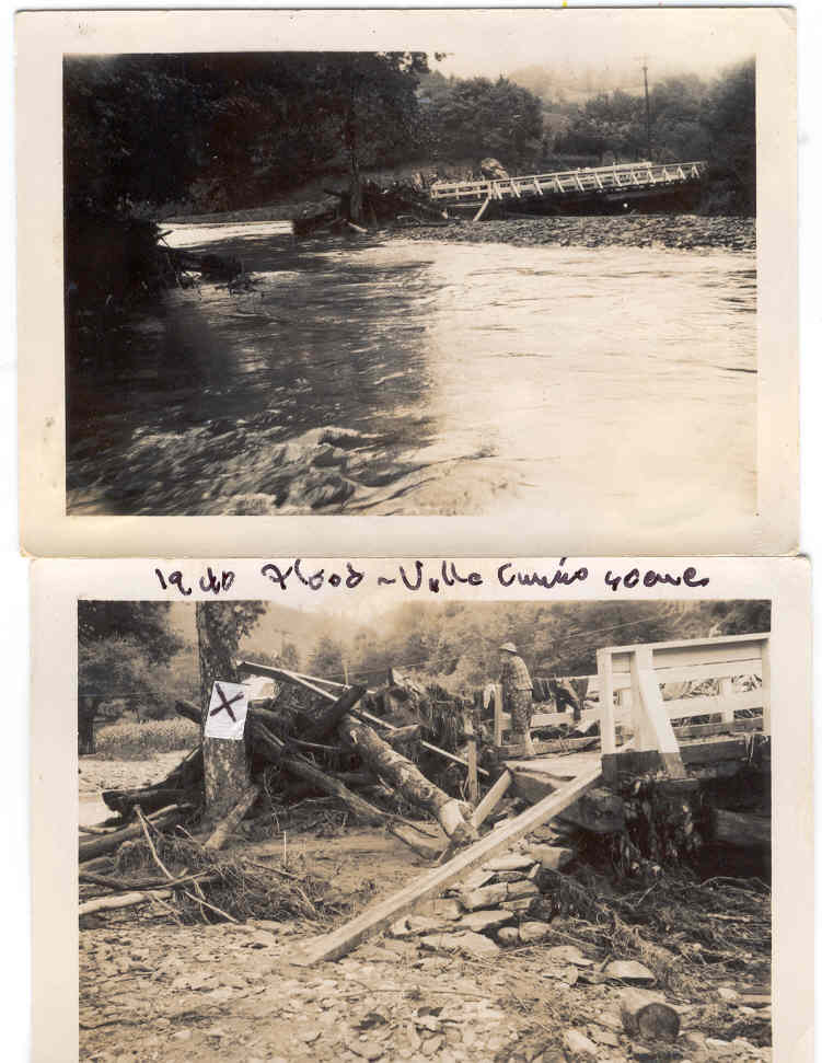 Top photo shows the bridge that spans Dutch Creek at Valle Crucis. It was pushed partly off its foundation by debis and had to be dismantled. Bottom photo shows large amount of debis that lodged against the end of bridge. Who is the person shown on the bridge ?? "X" shows the Howard and Ann Mast house in the distance. |