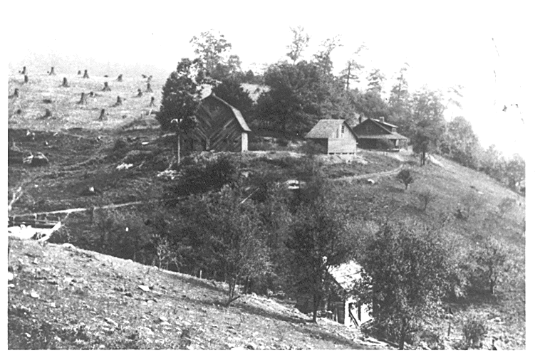 BELOW: The Ben and Dixie Farthing family moved here in 1938 from Valle Crucis, 6 miles up the Watauga River. The hill behind the house is planted in corn, which has been cut and placed in shocks. When we moved here, the house had no electric service, no indoor plumbing, no running water, no kitchen cabinets, and was not painted. The second floor was totally unfinished, and had no flooring. We carried water from a spring located near the old LOG HOUSE at lower right. After moving here, my dad and mother started improving the property, including: building kitchen cabinets, building a complete water system, ( including a 1000 gallon reservoir, 350 yards away, and piping it into the house,) painting and underpining the house and building several rock walls and walkways to the house. The rocks used in the building of these walls and walkways came from this property and another property, 1 mile away. In the early 1940s, a bathroom was installed and the second floor was converted into 3 bedrooms.I recently spoke with an elderly lady who related that her parents lived in this house, at lower right, many years ago and SHE was born in this log house in 1920!! In 1941 my father, Ben W. Farthing, took down this old structure and installed livestock weighing scales at this location. His father (William Farthing) helped construct the new scale shed. The house at right was constructed in the mid 1920s by the previous owner. The huge barn at left and the building between the barn and house were constructed by my father, in 1935, when we still lived at VALLE CRUCIS, 6 miles "up" the Watauga River from this location. | ||||