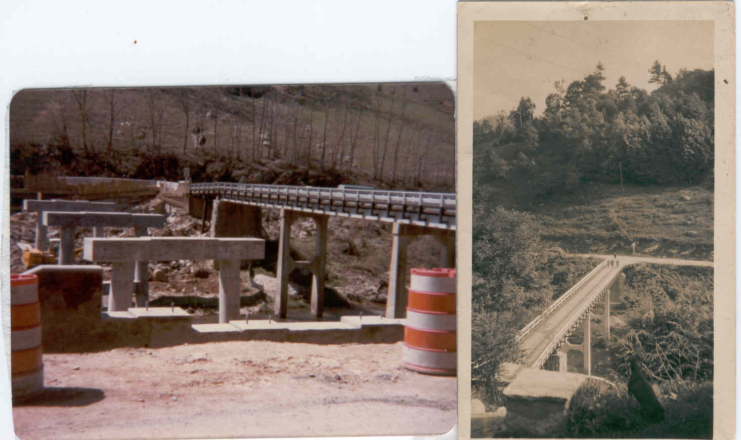 1984 photo shows the new double lane bridge under construction across the Watauga river at the Farthing farm. Bridge immediately at right is the one lane structure built in the fall of 1940 to replace the "washed out" original bridge. Right photo shows the bridge as it looked from our yard high above the river. | ||||