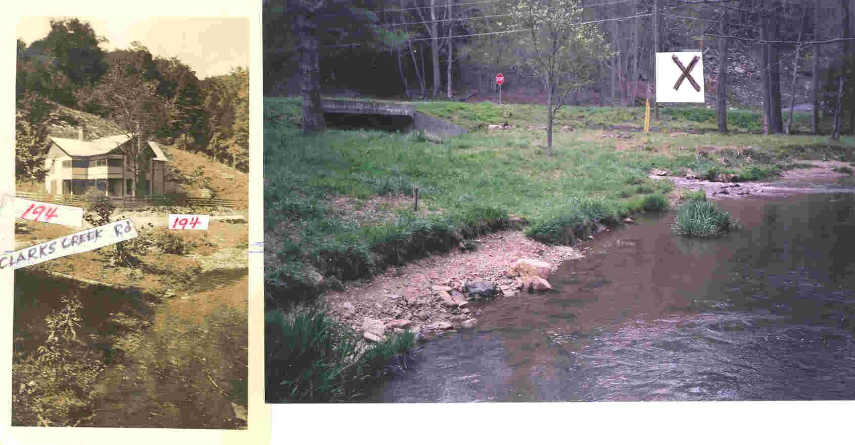 At left is the original house that Dad and Mother purchased in 1920 at Valle Crucis. Hwy 194 (dirt road at that time) and Clarks Creek road are shown. I was born here Dec. 1926 and Benjy and Dixie (twins) were born here in 1930. At right is the area today.(2005). Dad and mother sold the property in 1938 and we moved to their farm 6 miles away in Laurel Creek Township. A major flood swept through this area, August 1940 and this house was badly damaged. After the flood, the new owner sold the lot to the N.C.State HWY. Dept. and they relocated the road through the lot in order to get it further away from Dutch Creek. X is former house location. |