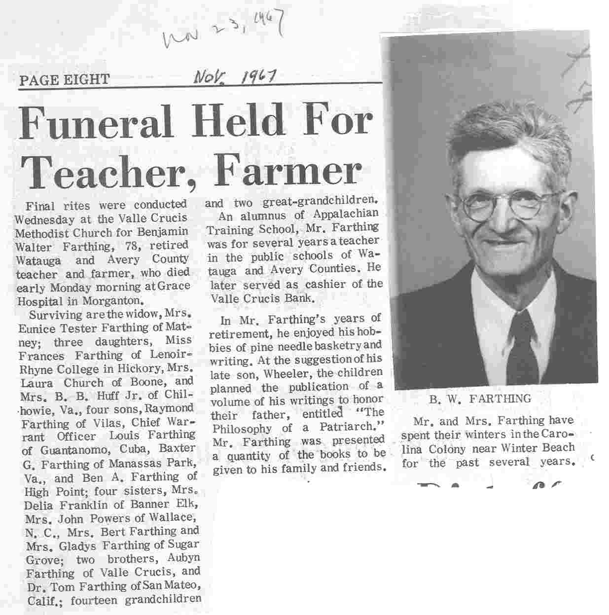 My father's obituary as it appeared in the Watauga Democrat, November 1967 in Boone, N.C.