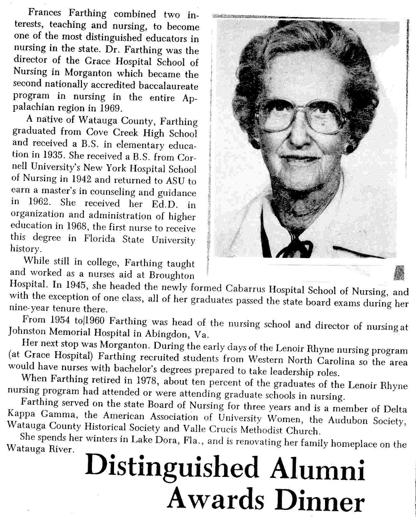Frances Farthing receives Distinguished Alumni Award from Appalachian University in Boone, N.C. October 11, 1985.