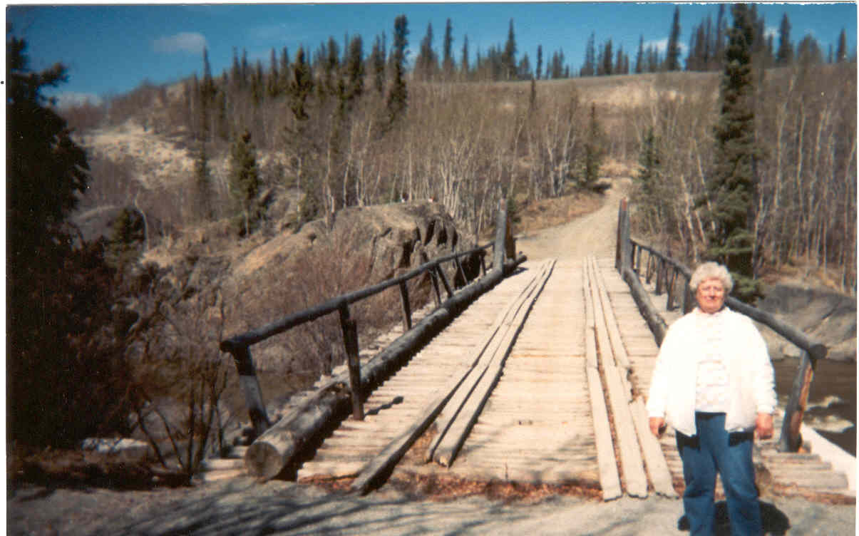 Reba is shown at one of the original wooden and log bridges that carried traffic when the AK HWY was first constructed in 1942. There were 130 such bridges on the original highway. The AK hwy was relocated a few hundred yards away some years later, but this bridge was left intact for historical reasons. Most of the wooden bridges have been replaced with modern steel and concrete structures. | ||||